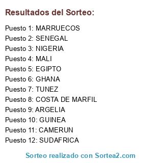 Lista de participantes: CAMERUN, COSTA DE MARFIL, NIGERIA, GHANA, SENEGAL, SUDAFRICA, MARRUECOS, TUNEZ, ARGELIA, GUINEA, EGIPTO, MALI.