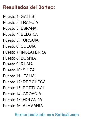 Lista de participantes: ESPAÑA, HOLANDA, FRANCIA, PORTUGAL, SUECIA, INGLATERRA, ALEMANIA, ITALIA, BELGICA, RUSIA, GALES, BOSNIA, CROACIA, SUIZA, REP.CHECA, TURQUIA.