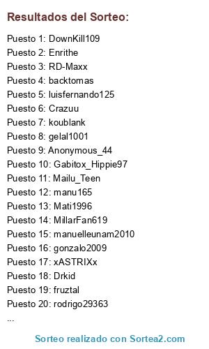 Lista de participantes: chicoseba12, Mailu_Teen, ales207, backtomas, koublank, Crazuu, xASTRIXx, pucci96, luisfernando125, fruztal, Albiceleste_8, Gabitox_Hippie97, Enrithe, Drkid, gelal1001, Barcops, DownKill109, manu165, BAZMALIGNUS, rodrigo29363, Anonymous_44, zizu902, manuelleunam2010, Mati1996, ElMatador11, gonzalo2009, RD-Maxx, mototask4, MillarFan619.