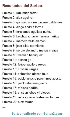 Lista de participantes: sebastian alejandro, rxben jara, sergio alejandro mejias mejias, osvaldo jauregui mella, alex fhrann, diego cifuentes, rodrigo andres, gonzalo andres pizarro galdames, javito andres, abraham isaac horta horta, alex aguirre, sebastian alonso faus, leonardo julio pereira, carlos eduardo vergara diaz, ketchup ignacio herrera muñoz, pablo ignacio latorre pavez, luis arturo hernandez ramos, juan pablo fuentes julio, diego andres torres, diego ignacio, mauricio araya labra, patrick villagran, rene ignacio cortes santander, raul britto tatter, daniel daniroquai daniro, oscar alejandro becerra fuentes, felipe quinteros alarcon, felipe aguilera reyes, damian henriquez, cristian vargas, pablo ignacio palominos acosta, juan andres, sergio palma, moises badilla, yhonatan vargas, matias milla, pablo abarzua guerra, andrees zamorano, toal dl bulla, cristian lobos villalobos, sebastian albarran, gonzalo mendez morgado, alberto rodriguez, jose contulliano, alonso gp, ian morales, jose elias sarmiento, mario sepulveda salazar, cesar alexis perez, bayron kun pacheco, marcelo valle alarcon, juan pablo, diego rodriguez, feranando aguilera nuñez.