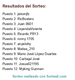 Lista de participantes: Josue021195, anyelotty, Myking Guzman, RicBostero, Mario José López Duartes, LeyendaViviente, Ricardo PR13, Carbajal José, ronny 1705, Matias_210, jeisonjfz, Juan 0601.