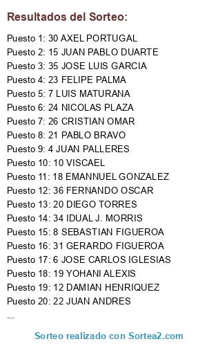 Lista de participantes: 1 FHRANN ALEX, 2 NICOLAS RODRIGUEZ, 3 PABLO INOSTROZA, 4 JUAN PALLERES, 5 J ALBERTO, 6 JOSE CARLOS IGLESIAS, 7 LUIS MATURANA, 8 SEBASTIAN FIGUEROA, 9 FRANCISCO JAVIER, 10 VISCAEL, 11 BRUNO ARIAS, 12 DAMIAN HENRIQUEZ, 13 JUAN DAVID, 14 PABLO MA, 15 JUAN PABLO DUARTE, 16 JAVIER CASTILLO, 17 ISAIAS JMZ, 18 EMANNUEL GONZALEZ, 19 YOHANI ALEXIS, 20 DIEGO TORRES, 21 PABLO BRAVO, 22 JUAN ANDRES, 23 FELIPE PALMA, 24 NICOLAS PLAZA, 25 JUAN JOSE SEPULVEDA, 26 CRISTIAN OMAR, 27 ISAEL CALDERON, 28 LUIS FERNANDO, 29 ANDRES STRELLO, 30 AXEL PORTUGAL, 31 GERARDO FIGUEROA, 32 MIGUEL CALVILLO, 33 MARCOS JONATAN, 34 IDUAL J. MORRIS, 35 JOSE LUIS GARCIA, 36 FERNANDO OSCAR.