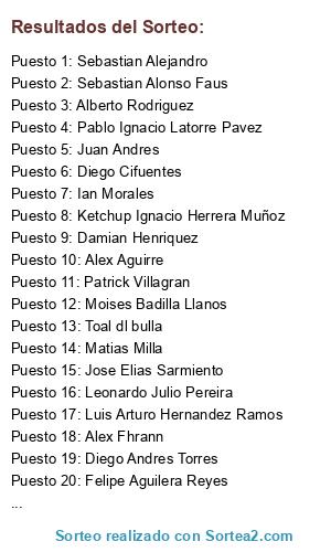 Lista de participantes: Juan Pablo, Ketchup Ignacio Herrera Muñoz, Diego Andres Torres, Jose Elias Sarmiento, Pablo Ignacio Latorre Pavez, Alberto Rodriguez, Diego Cifuentes, Felipe Aguilera Reyes, Leonardo Julio Pereira, Toal dl bulla, Damian Henriquez, Alex Aguirre, Bayron Kun pacheco, Sebastian Alonso Faus, Jose Contulliano, Moises Badilla Llanos, Patrick Villagran, Pablo Guerra Abarzua, Alex Fhrann, Juan Andres, Ian Morales, Luis Arturo Hernandez Ramos, Matias Milla, Sebastian Alejandro.