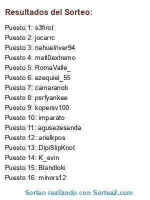 Lista de participantes: nahuelriver94, camaranob, ezequiel_55, jocarrc, Blandloki, imparato, psrfyankee, s3firot, arielkpos, DipiSlipKnot, mati0extremo, RomaValle_, kopersv100, minors12, agusezesanda, K_evin.
