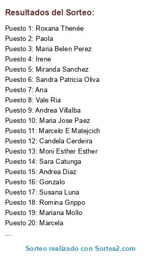 Lista de participantes: Roxana Thenée(2 participaciones), Miranda Sanchez(2 participaciones), Amalia Scelato(2 participaciones), Romina Grippo(2 participaciones), Sandra Patricia Oliva(2 participaciones), Mariana Mollo(2 participaciones), Mara(2 participaciones), Paola(2 participaciones), Sara Catunga(2 participaciones), Candela Cerdeira(2 participaciones), Maria Belen Perez(2 participaciones), Moni Esther Esther(2 participaciones), Marcela(2 participaciones), Adriana(2 participaciones), Ana(2 participaciones), Vale Ria(2 participaciones), Marcelo E Matejcich(2 participaciones), Rocio Romero(2 participaciones), Andrea Diaz(2 participaciones), Gonzalo(2 participaciones), Irene(2 participaciones), Andrea Villalba, Susana Luna, Normis Rom, Maria Jose Paez.