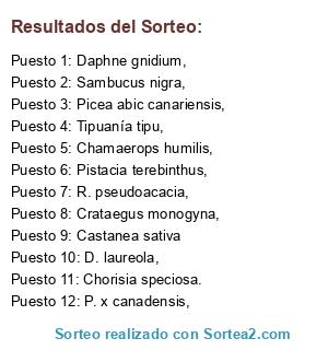 Lista de participantes: Chorisia speciosa., Buxus sempervirens, , Buxus balearica., Opuntia sp., Abelia sp, , Lonicera etrusca, , Lonicera implexa, , Lonicera japonica, , Lonicera periclymenum,, Sambucus nigra, , Viburnum lantana, , Viburnum opulus, , Viburnum tinus., Casuarina eunninghamiana,, Cauduarina equisetifolia., Euonymus japonicus., Cistus sp., , Halimium sp. , Santolina chamaecyparissus., Cornus sanguinea., Elaeagnus angustifolia., Arbutus unedo,, Arctostaphylos uva-ursi,, Calluna vulgaris, , Erica sp., , Rhododendron sp., Euphorbia pulcherrima., Castanea sativa, Fagus sylvatica, , Quercus canariensis, , Q. coccifera, , Q. faginea. , Q. ilex, , Q. petraea, , Q. pubescens, , Q. pyrenaica, , Q. robur, , Q. rubra, , Q. suber., Pelargonium sp., Aesculus hippocastanum., Hydrangea macrohylla,, Philadelphus coronarius., Juglans regia., Lavandula angustifolia,, L. dentata, , L. latifolia, , L. multifida, , L. stoechas, , Mentha sp. , Phlomis purpurea,, Rosmarinus officinalis, , Teucrium fruticans, , Thymus sp., Laurus nobilis., Acacia sp., , Bauhinia sp., , Ceratonia siliqua, , Cercis siliquastrum, , Coronilla valentina subsp. glauca, , Cytisus grandiflorus, , Geništa sp., , Gleditsia triacanthos, , Retama monosperma, , R. sphaeročarpa, , R. pseudoacacia, , Sophorå japonica, , Spartium junceum, , Tipuanía tipu, , Ulex sp. , Asparagus sp. , Ruscus sp., Lagerstroemia indica,, Punica granatum., Liriodendron tulipifera,, Magnolia grandiflora., Hibiscus rosa-sine nsis., Melia azedarach., Araucaria excels., Chamaecyparis lawsoniana., Cupressus arizonica., Cupressus macrocarpa. , Cupressus semp., Juniperus communis, , Jupinerus phoenicea, , Juniperus oxycedrus, , Juniperus thurifera,, Platycladus orientalis,, Tetraclinis a Thuja plicata., Cycas revoluta., Ephedra fragilis., Ginkgo bilo ba., Abies alba, , Abies pinsapo, , Cedrus atlantica, , Cedrus deodara, , Cedrus libani, , Picea abic canariensis, , P. halepensis, , P. pinea, , P. pinaster, , P. sylvestris, , P. uncinata., Taxus baccata. , Sequoia sempervirens,, Sequoiadendron giganteum,, Taxodium sp., Acer campestre, , Acer monspessulanum, , Acer. negundo, , Acer opalus, , Acer platano pseudoplatanus., Agave americana, , Dracaena drago, , Yucca sp. , Pistacia lentiscus, , Pistacia terebinthus, , Schinus molle., Nerium oleander, , Vinca sp., Ilex aquifolium., Hedera helix., Berberis europaeus, , Mahonia aquifolia., Alnus glutinosa, , Betula alba, , Betula pendula, , Carpinus betulus, , Corylus avellana., Catalpa bignonioides,, Jacaranda mimosifolia., Ficus sp., , Morus alba, , M. nigra., Myoporum laetum., Callistemon sp., , Eucalyptus camaldulensis, , E. globulus, , Myrtus communis., Bouganvillea sp., Fraxinus angustifolia, , F. excelsior, , F. ornus, , Jasminum fruticans, , J. officinale, , Ligustrum lucidum, , L, ovalifolium, , L. : vulgare, , Olea europaea, , Phillyrea angustifolia, , P. latifolia, , Syringa vulgaris., Chamaerops humilis,, Phoenix canariensis, , P. dactylifera, , Washingtonia sp., Phytolacca dioica., Platanus x his panica., Pittosporum tobira., Limoniastrum mo nopetalum, , Limonium sp., Arundo donax, , Phragmites australis,, Phyllostachys sp., Grevillea robusta., Aconitum napellus, , Clematis cirhosa,, C. flammula, , C. vitalba, , Delphinium sp., , Helleborus sp., , Ranunculus sp., Frangula alnus, , Rhamnus alaternus,, R. catharticus,, R. Iycioides., Amelanchier ovalis,, Cotoneaster sp., , Crataegus monogyna, , Malus sp., , Prunus avium, , P. cerasifera var. pisardii, , P. lauroceras us, , P. lusitanica, , P. padus, , P. spinosa, , Pyracantha coccinea, , Pyrus sp.,, Rosa sp., , Sorbus aria, , S. aucuparia, , S. domestica, , S. intermedia, , S. torminalis, , Spiraea sp., Citrus aurantium., Populus alba, , P. x canadensis, , P. nigra, , P. tremula, , Salix alba, , S. atrocinerea, , S. babylonica, , S. caprea, , S. elacagnos, , S. fragilis., Ailanthus altissima., Cestrum nocturnum., Brachychiton populne us., Tamarix africana,, T. gallica,, T. parviflora., Daphne gnidium, , D. laureola, , D. mezereum., Tilia cordata, , T. platyphyllos, , T. tomentosa., Celtis australis, , Ulmus glabra, , U. minor, , U. pumila., Lantana camara, , Vitex agnus-castus., Parthenociss us tricus pidata, , Vitex vinifera..