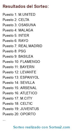 Lista de participantes: HEERENVEEN, VALENCIA, ESPANYOL, M.CITY, LEVANTE, SEVILLA, REAL MADRID, BARCELONA, FLAMENGO, MALAGA, PSG, INTER, JUVENTUS, ARSENAL, BAYERN, OSASUNA, CELTA, RAYO, OPORTO, BASILEA, CELTIC, M.UNITED, ATLETICO, MILAN.