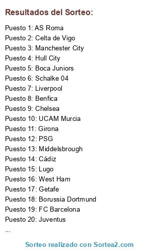 Lista de participantes: Boca Juniors, Liverpool, Real Madrid, Chelsea, Manchester City, Levante, Manchester United, Atletico de Madrid, Arsenal, Cádiz, Bayern Munich, Borussia Dortmund, Getafe, Middelsbrough, Schalke 04, Benfica, UCAM Murcia, Sevilla, Deportivo de la Coruña, PSG, Hull City, AS Roma, Celta de Vigo, FC Barcelona, Juventus, Osasuna, West Ham, Girona, FK Shajtar Donetsk, Villarreal, Lugo, Sporting de Gijon.