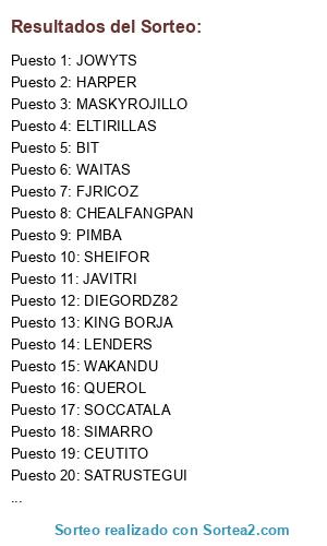 Lista de participantes: BIT, CEUTITO, CHEALFANGPAN, DIEGORDZ82, ELTIRILLAS, FERALBER, FJRICOZ, FLORENKIKO, HARPER, JAVITRI, JOWYTS, KING BORJA, LENDERS, LORENZO, MARCIAL, MASKYROJILLO, PIMBA, QUEROL, SATRUSTEGUI, SHEIFOR, SIMARRO, SOCCATALA, WAITAS, WAKANDU.