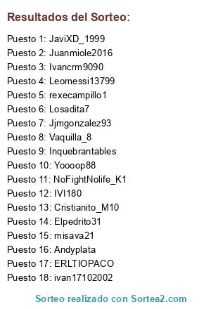 Lista de participantes: rexecampillo1, Leomessi13799, JaviXD_1999, Juanmiole2016, Inquebrantables, Jjmgonzalez93, ivan17102002, NoFightNolife_K1, Yoooop88, IVI180, Losadita7, misava21, ERLTIOPACO, Ivancrm9090, Cristianito_M10, Elpedrito31, Andyplata, Vaquilla_8.