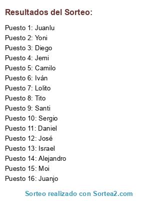 Lista de participantes: Alejandro, Camilo, Daniel, Diego, Israel, Iván, Jemi, José, Juanjo, Juanlu, Lolito, Moi, Santi, Sergio, Tito, Yoni.