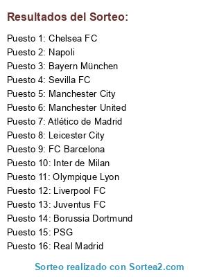Lista de participantes: Atlético de Madrid, FC Barcelona, Bayern München, Borussia Dortmund, Chelsea FC, Inter de Milan, Juventus FC, Leicester City, Liverpool FC, Manchester City, Manchester United, Napoli, Olympique Lyon, PSG, Real Madrid, Sevilla FC.
