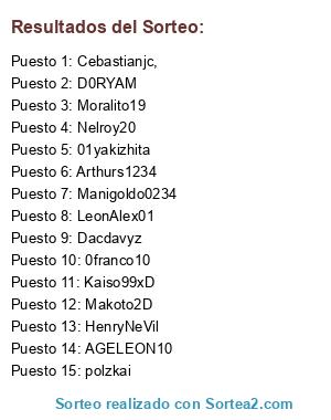 Lista de participantes: Cebastianjc,, HenryNeVil, Kaiso99xD, polzkai, Dacdavyz, Moralito19, Nelroy20, 0franco10, 01yakizhita, D0RYAM, AGELEON10, Manigoldo0234, LeonAlex01, Makoto2D, Arthurs1234.