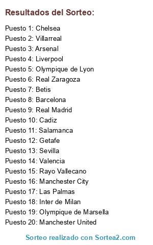 Lista de participantes: Salamanca, Betis, Arsenal, Cadiz, Real Zaragoza, Inter de Milan, Sevilla, Olympique de Lyon, Valencia, Getafe, Manchester City, Las Palmas, Liverpool, Barcelona, Chelsea, Manchester United, Olympique de Marsella, Villarreal, Rayo Vallecano, Real Madrid.