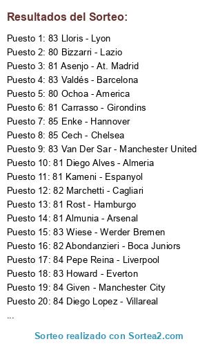 Lista de participantes: 80 Weidenfeller - Borussia, 80 Ochoa - America, 80 Handanovic - Udinese, 80 Lehmann - Stuttgart, 80 Bizzarri - Lazio, 80 Helton - Oporto, 81 Almunia - Arsenal, 81 Green - West Ham U, 81 Carrasso - Girondins, 81 Rost - Hamburgo, 81 Asenjo - At. Madrid, 81 Kameni - Espanyol, 81 Diego Alves - Almeria, 81 Demirel - Fenerbache, 82 Friedel - Aston Villa, 82 Abbiati - AC Milan, 82 Marchetti - Cagliari, 82 Palop - Sevilla, 82 Abondanzieri - Boca Juniors, 83 Howard - Everton, 83 Van Der Sar - Manchester United, 83 Lloris - Lyon, 83 Mandanda - Merseille, 83 Neuer - Schalke 04, 83 Wiese - Werder Bremen, 83 Valdés - Barcelona, 84 Pepe Reina - Liverpool, 84 Given - Manchester City, 84 Adler - Bayern Leverkusen, 84 Diego Lopez - Villareal, 85 Enke - Hannover, 85 Cech - Chelsea, 85 Akinfeev - CSK Moscú.