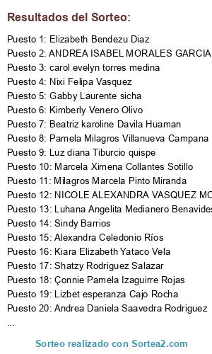 Lista de participantes: Gianella Olivares Carbajal, Maricruz Bonifacio, Diana De La Cruz Rimayhuaman, Nataly Joselyn Salinas Negrete, Wendy Fabiola Cáceres Arévalo, Lizbet esperanza Cajo Rocha, Sori Asmat vargas, Emily Geraldine VENTURA BAÑOS, Anay Reinoso Gay, Shatzy Rodriguez Salazar, carol evelyn torres medina, Allison Alejandra Coronel Salinas, NICOLE ALEXANDRA VASQUEZ MORALES, Kattyuska lamas salazar, Solange Saavedra Feijoo, Karmen Giulianna Bustamante Barreto, Kathya Guadalupe Salazar Quispe, Estephany Campos Cuba, Nixi Felipa Vasquez, Aleli Ramos Fonseca, Beatriz karoline Davila Huaman, Luhana Angelita Medianero Benavides, Andrea Daniela Saavedra Rodriguez, Carolina Palomino Ponce, Elizabeth Bendezu Diaz, KIARA PIERINA CARRANZA MENDOZA, Valeria Jimena Jiménez Morales, Andrea Carolina Torres Castillo, Karen Rosado, Milagros Marcela Pinto Miranda, Pamela Soto rivera, Gabby Laurente sicha, Kimberly Venero Olivo, KATHERINE AMALIA ARMAS Rincon, Pamela Agüero Bernaola, Salma nicole Ipanaque Camogliano, Gesabell Atenas Melgar Ascencio, Alexandra Celedonio Ríos, Zayda Rosemarie Chempen Zegarra, Pamela Milagros Villanueva Campana, Yahaira Solange Rosales Espinoza, Paola giuliana Bellido Mendiola, Kiara Elizabeth Yataco Vela, Sindy Barrios, Marycielo Santisteban, Kiara Gianella López Navarro, Doris Mileni Panduro justo, Akira Gisell Llomtop Fernandez, Çonnie Pamela Izaguirre Rojas, Antonella Bonelli, Luz diana Tiburcio quispe, Keyla Emilar Durán Gutierrez, Marcela Ximena Collantes Sotillo, Marianela del Pilar GALARRETA PALACIOS, ANDREA ISABEL MORALES GARCIA.