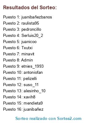Lista de participantes: juanicoo, xavih8, Admin, raulista95, mendieta9, pedroncillo, etnies_1993, suso_11, Serluis20_2, Txutxi, juanibañez, juanibañezbanos, antoniofan, pelizelli, alesinho_10, minavit.
