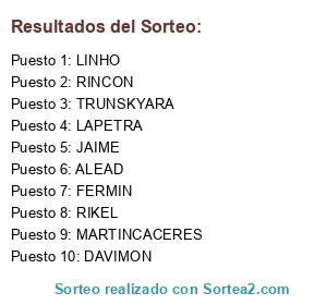 Lista de participantes: ALEAD, DAVIMON, FERMIN, JAIME, LAPETRA, LINHO, MARTINCACERES, RIKEL, RINCON, TRUNSKYARA.
