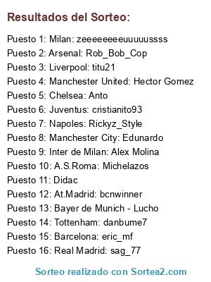 Lista de participantes: At.Madrid: bcnwinner, Napoles: Rickyz_Style, Juventus: cristianito93, Liverpool: titu21, Tottenham: danbume7, Arsenal: Rob_Bob_Cop, Milan: zeeeeeeeeuuuuussss, Bayer de Munich - Lucho, Inter de Milan: Alex Molina, Chelsea: Anto, Manchester United: Hector Gomez, Manchester City: Edunardo, Real Madrid: sag_77, Barcelona: eric_mf, A.S.Roma: Michelazos, Didac.