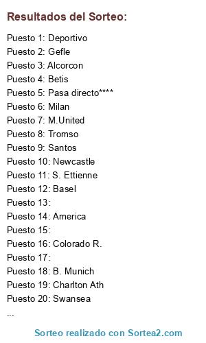 Lista de participantes: Santos, S. Ettienne, Tromso, Ath. Bilbao, Panathinaikos, Earthquakes, Arsenal, Vasco da Gama, Huesca, Tottemham, Toulouse, Toronto, Chelsea, Siena, Westerlo, Barça, Anzhi, SK Brann, B. Munich, America, Colorado R., At. Madrid, Feyenoord, C.Dragons, PSG, S. Pauli, Livorno, B. Dortmund, LA Galaxy, R. Chorzow, Napoli, Wigan, Le Mans, Juventus, Boca J., Gimnastic, Liverpool, Valenciennes, Estudiantes, M.United, Deportivo, Alcorcon, Milan, Betis, Gefle, R. Madrid, Zaragoza, Chicago Fire, Valencia, Swansea, Cartagena, Inter, Barça B, Las Palmas, Newcastle, Basel, Charlton Ath, M. City, Valladolid, Stabia, Pasa directo*, Pasa directo**, Pasa directo***, Pasa directo****.