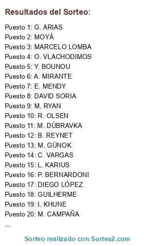 Lista de participantes: A. LUNEV, M. DÚBRAVKA, C. VARGAS, Y. BOUNOU, MARCELO LOMBA, O. KARNEZIS, A. MIRANTE, B. REYNET, M. SPORTIELLO, DAVID SORIA, B. FOSTER, TIAGO VOLPI, MOYÀ, I. KHUNE, GUILHERME, T. HEATON, S. ROMERO, MARCELO GROHE, S. ULREICH, L. KARIUS, M. GÜNOK, P. BERNARDONI, A. LAFONT, VICTOR, O. VLACHODIMOS, E. MENDY, M. CAMPAÑA, DIEGO LÓPEZ, J. BUTLAND, M. RYAN, R. OLSEN, G. ARIAS.