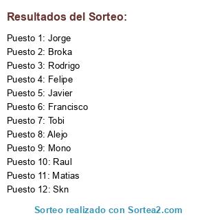 Lista de participantes: Raul, Broka, Matias, Alejo, Francisco, Tobi, Felipe, Javier, Mono, Skn, Rodrigo, Jorge.