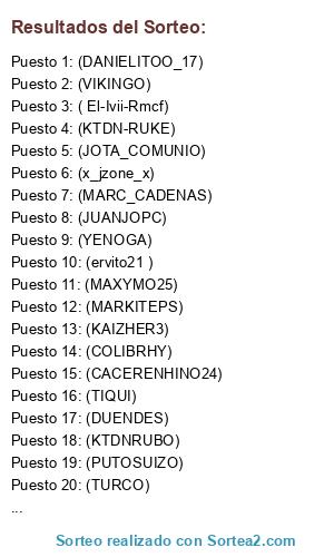 Lista de participantes: (ervito21 ), (x_jzone_x), (DANIELITOO_17), (MAXYMO25), (KTDNRUBO), (YENOGA), (COLIBRHY), (JUANJOPC), (ALEXAE), (KAIZHER3), (MARKITEPS), (MARIOMEKE), (TURCO), (PUTOSUIZO), (VIKINGO), (TIQUI), ( El-Ivii-Rmcf), (KTDN-RUKE), (DUENDES), (JOTA_COMUNIO), (MARC_CADENAS), (CACERENHINO24).