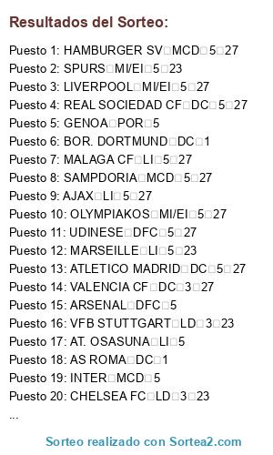 Lista de participantes: FC BAYERN DC 5 27, INTER MCD 5, MARSEILLE LI 5 23, VALENCIA CF DC 3 27, RCD ESPANYOL MD/ED 5 27, MALAGA CF LI 5 27, GENOA POR 5, ARSENAL DFC 5, LEEDS UNITED DFC 5, ATLETICO MADRID DC 5 27, UDINESE DFC 5 27, HAMBURGER SV MCD 5 27, CHELSEA FC LD 3 23, PANATHINAIKOS MCD 5 27, FC BARCELONA DC 1, VILLARREAL CF DC 4 23, BOR. DORTMUND DC 1, AJAX LI 5 27, AT. OSASUNA LI 5, AS ROMA DC 1, OLYMPIAKOS MI/EI 5 27, GETAFE CF MC 5 27, SAMPDORIA MCD 5 27, OLYMPIQUE LYON LD 5 23, FIORENTINA LD 5 23, SEVILLA FC DFC 5 27, VFL WOLFSBURG DFC 1, VFB STUTTGART LD 3 23, REAL SOCIEDAD CF DC 5 27, SPURS MI/EI 5 23, BAYER 04 LI 1, PSV MI/EI 5 27, LIVERPOOL MI/EI 5 27.