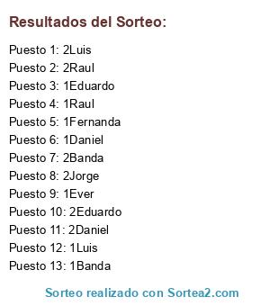 Lista de participantes: 1Daniel, 1Fernanda, 1Raul, 1Banda, 1Ever, 1Eduardo, 1Luis, 1Jorge, 2Daniel, 2Fernanda, 2Raul, 2Banda, 2Ever, 2Eduardo, 2Luis, 2Jorge.