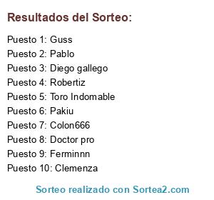Lista de participantes: Toro Indomable, Doctor pro, Robertiz, Pablo, Guss, Clemenza, Pakiu, Colon666, Diego gallego, Ferminnn.