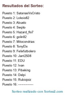 Lista de participantes: EDU, SatanasVsCristo, Jant2508, Lokoio82, Delpi, Ivan, TonyElx, Hazard_flo7, Pibeking, Seqito, golin82, Rubiojoiz, Felixfutbolero, Mitocondrias, Abuelo, --------------.