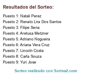 Lista de participantes: Carlos Ramón Miranda Rodríguez, Raquel Sts, Robson Caetano, Wagner Monteiro, Raquel S. Ortega, Patricia Cunha Vilar, Noemia Pessoa, Amigos, Cida Moreira, Simone Garcez, Rosângela Flórido, Mariza Matos, Orlando Gomes de Almeida, Javera Rosa João, Kamilla Santos, Roselete Valensuela, Patricio Mendes, Marco Antônio Fernandes, Alessandro Andrade, Rogerio Da Vitoria Ferreira, Jassanan Santos, Alex Macedo, Ádriia Souza, Ananda Savitri, Maicon Foox Dk, Ricardo Silva, Luciano Prates, Rute Garcia, Delmo Pinheiro Torres Pinheiro, Denise Martins, Regina Madureira, Wagner Navarro, Mara Coutinho, Cristina Costa, Bernadethe Lembranças de Festas, Kelvin Reis, Diego Rolim, Gilmar Do Santos, Vivi Figueira, Anacris Reis Dias, Lilian Ribeiro Soares, Amelia Petrushka, P Gileumar Heinrich, Rayssa Maia, Efrain Sebastian Aliaga Pajsi, Elisabeti Becker, Aliana Cerqueira, Simoni Rosa, Márcia Koslinski Marcante, Alexandre Borges, Bia Lemos, Eudes Alves, Stefano Frattesi, Te Gomes, Paola Vieira, Maicon Konig, Endy Alves, Adriana Aparecida de Mello, Viviani Dias Dias Miguel, Rosana de Jesus, Thalia Matos, Samilson Abreu, Gabriel Felipe, Thiara Maia, Angélica Silva Da PAz, Tatiana Gomes, Sonia Luna, Nádia Medeiros, Carol Marinho, Bárbara Alencar, Fernando Cesar, Paulo Sky, Rockysana Casas, Claudete Limberger, Suenia Lira, Anaclaudia Correia, Lukiinhas Martins Cordeiro, Arthur Queiroz Gousseaud, Mariah Almeida, Suusuh Maciel, José Play, Ivonny Rodrigues, Wesley Alves, Lucas Amaral, Deborah Mont, Carol Poka Rebouças, Hedery Vidigal, Luci France Santo Sosuza, Andressa Mello, Suzi Santos, Ariana Vera Cruz, Nelson Filho, Josiane Gonçalves da Silva, Carina Aragao, Dilma Vieira, Fábio Rodrigo Cavalcanti, Loana Caroline, Raah Sant, Maria Valpasso, Renan Costa, Artur Teixeira, Marcio Alves Gonçalves, Elias ̶a̶l̶v̶e̶s̶ ̶p̶e̶r̶e̶i̶r̶a̶, Maze Sierra, Quequeu Cardoso, Adna Mayara, Gerlane Lima, Alana Baqueiro, Mauricio Branda Lacerda, Fatima Senato, Lincoln Andrade Souza, Stephanie Lisse, Erisson Lucas, Wilma Silva, Gabriel Junio, Ivanir Silva, Mirella Monique Soares, Alemmar Ferreira da Fonseca, Anne Anne Brennand, Carlos Pinto Jr., Emerson Silva, Roseli Eugenio, Guilherme Serafim, Carla Ribas, Higor Lima, Willian Seij, Rhayan Vasconcelos, Glenda Sttefany, Emmily Aguida, Thiago Vasconcelos, Adriana Melo, Analita Lannes, Leticia Rezende Bonini Boratto, Silvia Iransos, Vittória Rezende Saraiva, Gabriel Sandes Barbosa, Jéssica Bernardo, Ciinthya Diias, Jonas Moraes, Luizfernando Aguiar, Debora Batista, Leandro Ferreira Dos Santos, Maria Gabriela, Breno Alves Rabelo, Suzianne Silva Ferreira, Eliane Aparecida L, Cacilda Quevedo, Danilo Monteiro, Silvane Munin Gadelha, Samira Ortolan, Maria Ramôa da Silva, Sonia Maria Aparecido, Diego Campos, Karina Martins, Marcelo Gomes Coelho de Sá, Fabricio De Melo Ávila, Antonio Original Original, Carlos Lemes, Elisangela Simone Petry, Louiziane Morais, Evandro Carlos de Godoy, Leonardo Silveira, Lincoln Costa, Márcia Habibe, Selma N. da Silva, Magaly Maria Dos Santos, Percio Wajnsztejn, Michel Costa, Luciomar Pereira, Manu Albuquerque, Monaliza Correia, Victori Vitao, Stallone Hoolingans, Incenso Santo, Rodrigo Mota Santos, Celso Nunes, Josiane Serena, Lary Degli, Gilvan Souza, Alice Andrade Vasconcelos, Bruna Camille Novaes, Gabriel Kurpel, Agatta Novaes, Theyllon Matarazzoo, Elizangela Victor, Paulo Marques da Silva, Isabel Martiela, Marcelo Nascimento, Cairo Dias, Ton Blond, Hamiltom Freire, Filipe Sena, Anderson Souza, Lucas Henrique Griebeler Santana, Aparecida Cunha Leite Bernardes, Gabriel Bernardes Calais, Yuri Maia Goulart Silva, Karlyanne Portela, Cassiano De Sousa Melo, Sol Lange Sol, Andryelle Marques, Celena Alves, Mara Giovanna, Nina Nista, Amanda Gomes, Carlos Zedi S Machado, Sid Mendes, Wiverson Soares Oliveira, Ivanise Ferreira, Murieli Fernandes, Ronise Jares Jares, Psmiranda Miranda, Mauro Reys, Daizire Verao Martins, Edna Silva, Izabela Sanchez, Ruth Ortiz Saad, Dulcineia Botaro, Joelma Martins, Luis Eduardo Silva, Ana Ogioni, Cayo Lucio, Cinthia Graciano, Rosiane Guimarães, Ramon Almeida, Fabio Medeiros, Alexandre Pereira Sanches, Luciana Barros, Marcelo Sousa, Carlos Mariana, João Adolfo, Gabryel Sátyro, Carla Souza, Imony Regina Regina, Carol Rodrigues, Emanuelle Uchoa, Angélica Nogueira Siqueira, Luiz Carlos Di Lourenço, Regina Diniz Gonsalves, Paulo Leal, Odett Belle, Nelsi Smaniotto, Jose De Sousa Lima, Cid Almeida, Adnir Inez Peres, Francielle Kagueyama, Matheus de Lucas, Natally Carneiro, Sammer Sant'Ana Almeida, Gabi Santos, Chamin Vzla, Moises Carolino, Rafael Aybar, Mara Regina, Raila Ambrosio, Raleigh Coelho, Maria Eduarda Santos, Amós Amaral de Souza, Andrézin Felippe, Carol Amaro, Jaqueline Alonso, Elizângela Carvalho, José Henrique Tavares, Laura Christina, Manu Silva, Altieres Rochteschel, Davidson Alves, Luan Michel, Paulo Elias Vieira, Rubens Yuri Jovanelli Jovanelli, Izildinha Maria, Guilherme Medeiros, Adonay Santos, Inez Fatima Oliveira, Julia Disconsi Seidl, Nivalci Claudiano, Kassyano Tamiarana, Samara Saraiva, France Heller, Joilma Sena, Loko Mersao Lopes, Mariana Noel, Kamyla Margutti de Souza, Ana Cristina Ferreira, Ivanilda Alves Bezerra, Pâmela Mendonça, Barbara Michelle Sudré, Claudia Toledo, Amanda Oliveira, Vially Pontarolo, Juliano Medeiros, Jose Geraldo Pereira Pereira, Marcus Daniel Daniel, Christopher Mazur, Erika Maximo, Luciana Pinto, Queide Rodrigues, Raul Della Torre, Marileuse Teresinha Gregolon, Paulo Almeida, Antônio Miranda, Gilsinho Rodrigues, Andre Luís Dutra, Paulo Morvam Morvam, Ricardo Barmann, Abel Valeriano Lino, Denise Mendonça, Jade Sylvya, Jair PinterJunior, Charles Sanca, Maria Rodrigues, Marcia Regina Vieira, Siméia Oliveira Ccb, Ronaldo Pereira De Araújo, Sah Tsugume, Mauricio Diniz, Caroline Lemos, Izani Ferreira Pinto, Lenilson Santana, Fernanda Moreti, Gabriel Lima, Pedro Daniel Fontenele, Fabricio Medeiros, Marcos Weslly, Flávio Colaquece