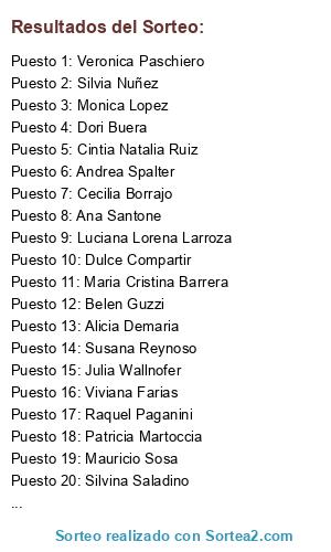 Lista de participantes: Silvia Nuñez, Patricia Martoccia, Melisa Kuperman, Maria Del Carmen Corradi, Gloria Quiroga, Cintia Natalia Ruiz, Romina Almada, Corina Soriano, Liliana Martin, Graciela Rolla, Graciela Fucci, Andrea Spalter, Liliana Sanchis, Alicia Ksharga, Alicia Demaria, Susana Reynoso, Mariela Sandes, Angie Cash, Maria Cristina Barrera, Teresita Mendoza, Maria Cristina Mesa, Dori Buera, Hebe Facchinetti, Cecilia Borrajo, Patricia Guevara, Adriana Sotelo, Luciana Lorena Larroza, Dulce Compartir, Tamara Duran, Patricia Iannaci, Marcela Laura Grosso, Silvina Saladino, Estela Gallimberti, Sin Drogas, María Fernanda Cuello, Ana Santone, Ester Fato, Monica Lopez, Marina Romairone, Raquel Paganini, Julia Wallnofer, Graciela Senande, Veronica Paschiero, Karina Zabala, Viviana Farias, Ruth Melgarejo, Rocio Provaci, Teresa Docampo, Paula Ortega, Gaby Aiello, Mauricio Sosa, Belen Guzzi, Noemi Garcia Gomez.