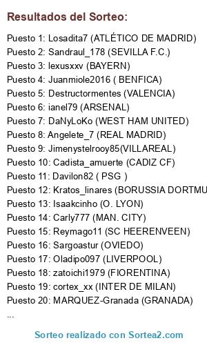 Lista de participantes: MARQUEZ-Granada (GRANADA), Kratos_linares (BORUSSIA DORTMUND), manuelgarcia1987 (BARC ELONA), Angelete_7 (REAL MADRID), Carly777 (MAN. CITY), jordi25 (CHELSEA), Oladipo097 (LIVERPOOL), ianel79 (ARSENAL), lexusxxv (BAYERN), Yiral87 (AS ROMA), Destructormentes (VALENCIA), Losadita7 (ATLÉTICO DE MADRID), Jimenystelrooy85(VILLAREAL), Jose_vallecas19 (MAN. UNITED), Reymago11 (SC HEERENVEEN), cortex_xx (INTER DE MILAN), Sandraul_178 (SEVILLA F.C.), DaNyLoKo (WEST HAM UNITED), Davilon82 ( PSG ), Cadista_amuerte (CADIZ CF), Juanmiole2016 ( BENFICA), Isaakcinho (O. LYON), zatoichi1979 (FIORENTINA), Sargoastur (OVIEDO).