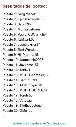 Lista de participantes: Josethekiller97, MGP_HUERTA29, PAM_Gabri16F1, R70_SUPERMARIO, Jaumoncio2003, Kpicavernicola03, ByJon95, MGP_Georgexx13, Diezzabel_10_53, Legend57Raul, Samutu_99, Diego_C4, ATW_migavi78, Ivileonfiera, Jaime_CD96, Javirome157, ItsMaark05, OMejías-, Chakel_14, Moi_FlyNet9, Ivan22x, Monsalvetorres, Reuls_99, Sergimenez, Titothebestone, Tortiw1, Pablo_CDCarriche, HiitPatriota15, Vatusau, CelsoGM9, Torets55, Toni-Wonders.