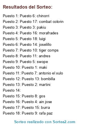 Lista de participantes: maki , martini , pakiu , ain jose, swope , chinorri , antonio el xulo , gos , rafa paz , tiger comps , andres , skidi kaiser , bombilla , joselillo , burra , morafrades , combat colorin , luigi.