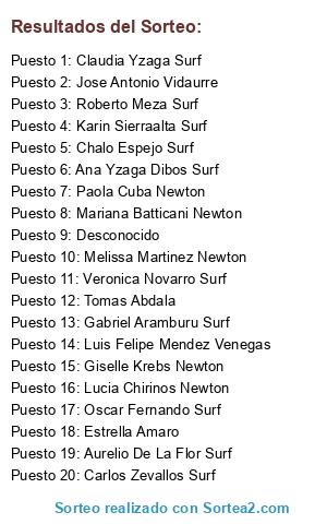 Lista de participantes: Carlos Zevallos Surf, Claudia Yzaga Surf(3 participaciones), Jose Antonio Vidaurre(2 participaciones), Roberto Meza Surf(6 participaciones), Chalo Espejo Surf(4 participaciones), Tomas Abdala, Estrella Amaro(2 participaciones), Veronica Novarro Surf(2 participaciones), Melissa Martinez Newton, Aurelio De La Flor Surf, Luis Felipe Mendez Venegas(3 participaciones), Ana Yzaga Dibos Surf(3 participaciones), Mariana Batticani Newton(2 participaciones), Lucia Chirinos Newton, Gabriel Aramburu Surf(3 participaciones), Desconocido(6 participaciones), Paola Cuba Newton, Giselle Krebs Newton, Karin Sierraalta Surf(3 participaciones), Oscar Fernando Surf(3 participaciones).