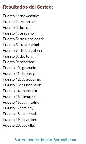 Lista de participantes: :athletic:, rayo, :at.madrid:, :fc barcelona:, Fronklyn, :español:, betis, :realmadrid:, :malaga:, :realsociedad:, granada, :sevilla:, :valencia:, :villarreal:, :arsenal:, :aston villa:, :blacburns:, :bolton:, :chelsea:, :everton:, :fulham:, :liverpool::, :m.city:, :m.united:, :newcastle:, :sunderland:, :totteham:, :wigan:.