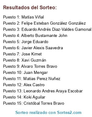 Lista de participantes: Cristóbal Torres Bravo, Matías Viñal, Leonardo Andres Araya Escobar, Alvaro Torres Bravo, Matias Perez Nuñez, Jose Kimet, Jorge Eduardo, Alex Castro, Xavi Guzmán, Juan Mengar, Koki Aguilar, Felipe Esteban González González, Eduardo Andrés Diaz-Valdes Gamonal, Javier Alexis Saavedra, Alberto Bustamante John.