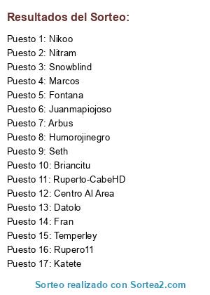 Lista de participantes: Arbus, Briancitu, Centro Al Area, Datolo, Fran, Fontana, Humorojinegro, Juanmapiojoso, Katete, Marcos, Nikoo, Nitram, Rupero11, Ruperto-CabeHD, Seth, Snowblind, Temperley.