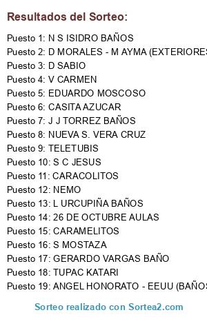 Lista de participantes: 18 DE MAYO, 26 DE OCTUBRE AULAS, A SCHWIMMER - J LECHIN, ABEJITAS, ALTO COCHABAMBA, ANGEL HONORATO - EEUU (BAÑOS), B SISA - C MEDINACELLI, BETHEL, BOLIVIA B, BUENA VISTA, CARACOLITOS, CARAMELITOS, CASITA AZUCAR, D MORALES - M AYMA (EXTERIORES), D SABIO, DR O CAMPERO, EDUARDO MOSCOSO, G MISTRAL BAÑOS, G VILLAGOMES - POTOSI (AULAS), GERARDO VARGAS BAÑO, GOLONDRINAS, GUSANITOS, I MONTES (BLO E ESTE), ISABELITA, J J TORREZ BAÑOS, JORGE TRIGO, KARA KARA, L URCUPIÑA BAÑOS, LIMITAS, M CARDENAS, N S ISIDRO BAÑOS, NEMO, NIÑO JESUS, NUEVA S. VERA CRUZ, NUEVO MILENIO, ORURO, OSCAR ROJAS (BLOQUE ESTE AULAS), PICAFLORES, POLLITOS, QUERUBINES, R CRESPO, R PRUDENCIO, S C JESUS, S FRANCISCO, S MOSTAZA, SAN MIGUEL, SAN NICOLAS (BAÑO NUEVO), TELETUBIS, TUPAC KATARI, V CARMEN, V ROSARIO, VIKINGA BOLIVIA (PARQUE), Winnie Pooh, .