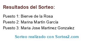 Lista de participantes: Adry Grace Apdelgani(-), Aintzanika Lopez(-), Alicia Carrero Marcos(-), Alicia Prieto Martín(-), Ana Alonso Corral(3 participaciones), Ana Garcia L(-), Ana Glez(-), Ana Maria Cruz Perez(-), Ana María González Otero(-), Ana Sastre(-), Andrea Haro(-), Angela Carpente Garcia(-), Angelines Fernandez(-), Antonio GN(8 participaciones), Avon Anne(5 participaciones), Azu Cigales(5 participaciones), Bienve de la Rosa(9 participaciones), Blanca Rodriguez(-), Buscador de Sorteos(-), Car Sa Bla(-), Carol Viola(-), Carolina Mami Duna(-), Cel Msc(-), Chan Vegas(10 participaciones), Charo Romero Álvarez(-), Chelo Moa(-), Chris Hana(6 participaciones), Cindi Maria Onecha(2 participaciones), Concepcion Matias Simarro(-), Cristina Ci(-), Cristina Fernández(-), Cristina Jurado(-), Cristina Martin Romero(-), Cristina Volta(-), Cynthia Villafa?e(-), Daniel Perez Val(5 participaciones), Desirée Ramírez Santano(-), Domingo Carrique(-), Eduardo Postigo(-), Elena Bagatchenko(-), Elena Knyazhechenko(-), Elisabeth Garcia(-), Encarni Estévez(-), Esther Mu?oz Martín(-), Eva Mari?o Sánchez(-), Eva Maria Diaz Hidalgo(2 participaciones), Fani Carbonell(-), Felicidad López Selas(-), Fidel Rivera Sanchez(-), Florin Ilie(-), Francisco González(-), Gabriela Mariana(-), Gonzalo Regueiro(-), Hamdou Sow(-), Inma Cervera(-), Irene Masip Morte(-), Isadora Mayandia(-), Ivan Monzon Garces(-), Jennifer Romero(-), Jesus Fernandez Romero(-), Josefa Peregrina Morales(5 participaciones), Juani Mendez Torres(-), Kapitana Corsaria Pirates(-), Katerina Knyazhechenko(-), Keren Miret Lara(-), La Quinta Esencia, Lali Pujala(-), Liz Medina(5 participaciones), Lola Armero Cruz(-), Loli Moreno Izquierdo(-), Ludy Fernández(-), Manuel Torres(2 participaciones), Maria Colomo Diaz(-), Maria Eugenia Arias Lozano(6 participaciones), Maria Jose Garcia Martin(-), Maria Jose Martinez Gonzalez(18 participaciones), Maria Jose Palmer Cerdan(-), María López Iglesias(-), Maria Pilar Ortiz(-), Maria R Simon(-), María Vanessa Méndez Mosquera(-), Maria Victoria Martos Sanchez(13 participaciones), Maria Wasmer Romero(-), Maribeco Cp(-), Marina Martín García(6 participaciones), Marta Dg(-), Marta Morales López(-), Marta Vallés Ortega(-), Martamiguelana Beni(5 participaciones), Martha Volta(-), Mary Conde Neira(-), Mary Olvera Geronimo(-), Mercedes Gutierrez Martinez(-), Michaela Weissova(16 participaciones), Miguel del Pozo(-), Mjlg Lg(-), Monica Brea Lopez(-), Montse Romero Ruedas(-), Nagore Arostegui Rojo(6 participaciones), Natalia Prieto Garcia(3 participaciones), Nicole Stephanie Espinoza E(-), Noelia Rodriguez Olivares(-), Nuria Bueno(5 participaciones), Nuria Del Campo Gonzalez(-), Núria Garcia(-), Nuria Perez Ortega(2 participaciones), Olga Pe?alver(-), Pablo Rubio Prestel(-), Patricia Beneite(2 participaciones), Patricia Villaca?as(-), Pepi Romero Alvarez(2 participaciones), Petruta Pirvu(-), Pilar Madrid(-), Pilar Moreno Madrid(2 participaciones), Rakel BolitasWorld(-), Rakel Brujita(-), Rakel Torres(-), Raquel Romero Ruedas(-), Rosa Rodriguez Ortiz(6 participaciones), Rosana Pulido Perez(6 participaciones), Rosi Jabalera(13 participaciones), Sandra Casado Mu?oz(-), Sergio Arnaiz Delgado(-), Sergio Navarro Torrejón(-), Sofia Esther Ruiz Garcia(11 participaciones), Soledad Rodriguez Lopez(-), Sonia Garate Embid(-), Susana Belzuz Pascual(-), Thais Giménez(-), To?y C. Soriano(-), Trini Fernandez, Tu Estilo Lencería Fina(-), Vanesa Calvo Chao(-), Vanesa Garcia Morales(-), Vanesa Romero Ruedas(-), Vanessa Arjona Tripiana(-), Vanessa Guerrero Peregrina(-), Veronica Gomez(-), Virgi Garcia(-), Viviana De Marco-Schapiro(-), Yliana Gomez Diaz(-), Yliana Gomez.