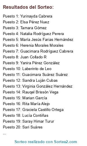 Lista de participantes: Jennifer Otero Fernández (5 participaciones), Cathayxa Jesé Castro Sánchez (5 participaciones), Lucía Contiñas (5 participaciones), Zaida Moreno (5 participaciones), Saray Himar Turur (5 participaciones), María Jesús Farias Hernández (5 participaciones), Manuel Andrade (5 participaciones), Yurinayda Cabrera (5 participaciones), Desiree Jiménez Benítez (5 participaciones), Elsa Pérez Nuez (5 participaciones), Julia Ramos Armas (5 participaciones), Irene Álvarez (5 participaciones), María del Mar Mirabal (5 participaciones), Carlos Álvarez (5 participaciones), Sandra Luján Cubas (5 participaciones), Laberinto de Leo (5 participaciones), Gladys Yo Misma (5 participaciones), Beatriz Curbelo (5 participaciones), Mary Nieves Gutiérrez (5 participaciones), Natalia Rodríguez Perera (5 participaciones), Virginia González Hernández (5 participaciones), Gara Santana, Diana García (5 participaciones), Noelia Ramos, Marian García (5 participaciones), María Mercedes León Donate (5 participaciones), Noelia Castellano Martín (5 participaciones), Gemma Yurena Déniz (5 participaciones), Susi Vega (5 participaciones), Judith Castro Santana (5 participaciones), Davinia Romano Trujillo (5 participaciones), Herenia Morales Morales (5 participaciones), Brenda Barrera (5 participaciones), Guacimara Rodríguez Cabrera (5 participaciones), Seija Pérez Castro (5 participaciones), Arii Love Adeel (5 participaciones), Guacimara Suárez Suárez (5 participaciones), Jennifer Rodríguez-Valdés (5 participaciones), Roberto Díaz (5 participaciones), Estrella Gopar Hernández (5 participaciones), Graciela Castillo Ortega (5 participaciones), Tatiana Rodríguez (5 participaciones), Lucía Jiménez Medina (5 participaciones), Rosa Delia (5 participaciones), Betsaida Alonso García (5 participaciones), Casilda Rodríguez Morente (5 participaciones), Yanira Pérez González (5 participaciones), Sari Suáres (5 participaciones), Teresa Salazar (5 participaciones), Ithaisa González Puig (5 participaciones), Davinia Martín (5 participaciones), Yanina Samijosky (5 participaciones), Juan Collado R (5 participaciones), Tamara Gómez (5 participaciones), Tarek Sosa (5 participaciones), Amanda Arteaga Sarmiento (5 participaciones), Rita María Alejo (5 participaciones), Melina Naves Di Prinzio (5 participaciones), Rauqel Brissón Vega (10 participaciones), Patricia Alonso Jorge (5 participaciones), Cecilia Ramírez Ramos (5 participaciones), Daina Aileen Santana Norzewu (4 participaciones), Daina Aileen Santana Norzewu.