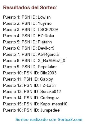 Lista de participantes: PSN ID: LSCB2009, PSN ID: Jumpedeel, PSN ID: X_RaMiReZ_X, PSN ID: Dilo2003, PSN ID: Kapo_messi10, PSN ID: Pepetaker, PSN ID: Gabloy, PSN ID: FZ-Roka, PSN ID: Yuyimo, PSN ID: Lowisn, PSN ID: A544garcia, PSN ID: Ssnake012, PSN ID: Platahh, PSN ID: Carlosguz, PSN ID: FZ-Latin, PSN ID: Devil-cr9.