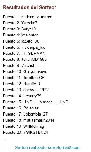 Lista de participantes: chevy_ _1992, Mariosofrv, fricknopa_fcc, camilo0512, Nacional110, X_Juankmfc_X, laujan1218, Garysnakeye, Bogotano18, DavidGutierrez2, Tinchomul, Lgrand10s, Carpal305, nelsinho23, maxxi_27, Juanse_aoki, Pepeasesino1, ElTumiPeru, stikjorJC17, Valcrist, PERUANOFORCE10, davidal1014, Botyz10, Fenomenal1993, onlysantew, Colombiannicko, Mateo_CFI, melendez_marco, Ricawoody14, FF-GERMAN, Jovanny1981, snake-075, snake-0751, Nathan_0223, peselepo, Hetchiring, DECANO_TORRES, Tu-muert3, jotalnator, Cfc_Zlatan, SergioAlbi-Rojo, matiasmarin2014, LM_Mafla_I9I, ironmaneslaond, cristhian_fistks, JAZON10FCB, Leodiaz_27, Axuby, Torettao-CFI, HND _ - Marcos - _ HND, o11ceCaldas, Lcharry79, LeanDami05, The_keane29, Ramagol5, torettoidag, XxfAlcoxX_, JavierOp915, flosanlopez17, adonko, Juanksh1133, Siiriiuus, joZeto_90, Cajf, JulianMB1986, Polaniar, CamiloDiaz6, YSIKSTBN24, JMpIx, Naluffy-D, JR-Palazzo, WillMolinag, Lokombia_27, diegoalvarez12, Andresmesa11, Unseaminghawk, Pablo_CJA, Yalexito7, Fer-Villa105, porritas.