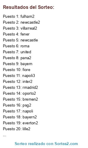 Lista de participantes: r.madrid, rmadrid2, barcelona, barcelona2, a.madrid, a.madrid2, sevilla, sevilla2, valencia, valencia2, villarreal, villarreal2, malaga, malaga2, bilbao, bilbao2, español, español2, a.vila, a.vila2, arsenal, arsenal2, chelsea, chelsea2, everton, everton2, fulham, fulham2, liverpool, liverpool2, city, city2, united, united2, tothenham, tothenham2, sunderland, sunderland2, newcastle, newcastle2, milan, milan2, genoa, genoa2, fiore, fiore2, juve, juve2, inter, inter2, lazio, lazio2, napoli, napoli3, roma, roma2, palermo, palermo2, udinese, udinese2, bayern, bayern2, lever, lever2, dortmund, dortmund2, hamburgo, hamburgo2, bremen, bremen2, worls, worls2, sttu, sttu2, shalke, shalke2, oporto, oporto2, benfica, benfica2, lisboa, lisboa2, cska, cska2, zenit, zenti2, ajax, ajax2, psv, psv2, pana, pana2, santos, santos2, gala, gala2, fener, fener2, besiktas, besiktas2, lyon, lyon2, marsella, marsella2, lille, lille2, girondins, girondins2, psg, psg2.