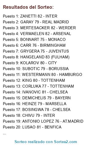 Lista de participantes: 1 Corluka Tottenham 79 LTD, 2 Iraola Bilbao 79 CAR, 3 Maxwell Barcelona 79 CAR, 4 Chygrynskiy Barcelona 79 DFC, 5 Jesús Gámez Málaga 77 LTD, 6 Pareja Espanyol 77 DFC, 7 Nunes Mallorca 78 DFC, 8 Metzelder Real Madrid 79 DFC, 9 Fernando Navarro Sevilla 77 LTI, 10 Bruno Saltor Valencia 77 LTD, 11 Dealbert Valencia 78 DFC, 12 Mathieu Valencia 78 LTI, 13 Alexis Valencia 79 DFC, 14 Miguel Valencia 77 LTD, 15 Godín Villarreal 78 DFC, 16 Gonzalo Rodríguez Villarreal 78 DFC, 17 Chalmé Girondins 79 LTD, 18 Ciani Girondins 79 DFC, 19 Tremoulinas Girondins 78 LTI, 20 Henrique Girondins 78 DFC, 21 Rolando Oporto 79 DFC, 22 David Luiz Benfica 79 DFC, 23 Mellberg Olympiakos 79 DFC, 24 Amorebieta Bilbao 79 DFC, 25 Bougherra Rangers 79 DFC, 26 Riise Roma 79 LTI, 27 Bonera Milán 79 DFC, 28 Kolarov Lazio 79 LTI, 29 Materazzi Inter 79 DFC, 30 Barzagli Milán 79 DFC, 31 Friedrich Hertha Berlín 79 DFC, 32 Delpierre Stuttgart 79 DFC, 33 Heinze Marsella 79 LTI, 34 Cris Lyon 79 DFC, 35 Revelliere Lyon 79 LTD, 36 Woodgate Tottenham 79 DFC, 37 Kompany Manchester City 79 DFC, 38 Jagielka Everton 79 DFC, 39 Baines Everton 79 LTI, 40 Heitinga Everton 79 DFC, 41 Ivanovic Chelsea 79 LTD, 42 Warnock Aston Villa 79 LTI, 43 Carriço Sporting de Lisboa 79 DFC, 44 Ujfalusi Atlético de Madrid 78 DFC, 45 Felipe Fiorentina 78 DFC, 46 Tasci Stuttgart 78 DFC, 47 Campagnaro Nápoles 78 DFC, 48 Subotic Borusia 78 DFC, 49 Taiwo Marsella 78 LTI, 50 Fanni SRFC 78 LTD, 51 Clerc Lyon 78 LTD, 52 Hughes Fulham 78 DFC, 53 Bassong Tottenham 78 DFC, 54 King Tottenham 78 DFC, 55 Brown Manchester United 78 DFC, 56 Evans Manchester United 78 DFC, 57 Richards Manchester City 78 LTD, 58 Zabaleta Manchester City 78 LTD, 59 Kyrgiakos Liverpool 78 DFC, 60 Fabio Aurelio Liverpool 78 CAR, 61 Belletti Chelsea 78 LTD, 62 Davies Aston Villa 78 DFC, 63 Cuellar Aston Villa 78 DFC, 64 Young Aston Villa 78 LTD, 65 Djorou Arsenal 78 DFC, 66 Anderson Polga Sporting de Lisboa 77 DFC, 67 Majstorovic AEK 77 DFC, 68 Criscito Genoa 77 CAR, 69 Moretti Genoa 77 LTI, 70 Accardi Sampdoria 77 DFC, 71 Burdisso Roma 77 DFC, 72 Kaladze Milán 77 DFC, 73 Jankulovski Milán 77 CAR, 74 Grosso Juventus 77 LTI, 75 Cáceres Juventus 77 LTD, 76 Santon Inter 77 CAR, 77 Beck Hoffenheim 77 LTD, 78 Boateng Hamburgo 77 DFC, 79 Dedé Borusia 77 LTI, 80 Dabo ASSE 77 LTD, 81 Armand PSG 77 LTI, 82 Cissokho Lyon 77 LTI, 83 Gritching Auxerre 77 DFC, 84 Caldwell Wigan 77 DFC, 85 Mensah Sunderland 77 DFC, 86 Hutton Sunderland 77 LTD, 87 Carr Birmingham 77 LTD, 88 Assou Ekotto Tottenham 77 LTI, 89 Rafael Manchester United 77 CAR, 90 Sylvinho Manchester City 77 LTI, 91 Bridge Manchester City 77 LTI, 92 Insua Liverpool 77 CAR, 93 Yobo Everton 77 DFC, 94 Paulo Ferreira Chelsea 77 DFC, 95 Campbell Arsenal 77 DFC, 96 Alex Silva Sao Paolo 77 DFC, 97 Cicinho Sao Paolo 77 CAR, 98 Tonel Sporting de Lisboa 76 DFC, 99 Fucile Oporto 76 LTD, 100 Pereira Benfica 76 CAR, 101 Sitaridis Panathinaikos 76 LTD, 102 Ibarra Boca 76 CAR, 103 Emre Asik Galatasaray 76 DFC, 104 Neill Galatasaray 76 LTD, 105 Mané Getafe 76 CAR, 106 M. Flaño Osasuna 76 DFC, 107 Nivaldo Valladolid 76 DFC, 108 Gregory Sporting 76 DFC, 109 Juanito Atlético de Madrid 76 DFC, 110 Brochetti Genoa 76 DFC, 111 Kroldrup Fiorentina 76 DFC, 112 Comotto Fiorentina 76 LTD, 113 Balzaretti Palermo 76 CAR, 114 Yepes Chievo 76 DFC, 115 Zapata Udinese 76 DFC, 116 Cassetti Roma 76 LTD, 117 Motta Roma 76 CAR, 118 Zúñiga Nápoles 76 CAR, 119 Onyewu Milán 76 DFC, 120 Oddo Milán 76 CAR, 121 Grygera Juventus 76 LTD, 122 Schafer Wolfsburgo 76 CAR, 123 Bouhlarouz Stuttgart 76 DFC, 124 Pander Schalke 04 76 CAR, 125 Aogo Hamburgo 76 CAR, 126 Felipe Santana Borusia 76 CAR, 127 Bisevac Valenciennes 76 DFC, 128 Bonnart Marsella 76 LTD, 129 Camara PSG 76 DFC, 130 Melchiot Wigan 76 LTD, 131 Neville Manchester United 76 LTD, 132 Onuhoa Manchester City 76 DFC, 133 Senderos Everton 76 DFC, 134 Bouma Aston Villa 76 LTI, 135 Silvestre Arsenal 76 DFC, 136 Roberto Carlos Corinthians 76 LTI, 137 Sidnei Benfica 75 DFC, 138 Quiroga River Plate 75 DFC, 139 Chico Almería 75 DFC, 140 Cortés Getafe 75 DFC, 141 Mario Getafe 75 DFC, 142 Weligton Málaga 75 DFC, 143 Dragutinovic Sevilla 75 DFC, 144 Konko Sevilla 75 CAR, 145 Monreal Osasuna 75 CAR, 146 Josetxo Osasuna 75 DFC, 147 Morris Racing 75 DFC, 148 Aitor Ocio Bilbao 75 DFC, 149 Colotto Depor 75 DFC, 150 Perea Atlético de Madrid 75 DFC, 151 Papac Rangers 75 LTI, 152 Braadheif Celtic 75 LTI, 153 Hinkel Celtic 75 LTD, 154 Danielli Genoa 75 DFC, 155 Gobbi Fiorentina 75 LTI, 156 Pasqual Fiorentina 75 DFC, 157 Goian Palermo 75 DFC, 158 Lukovic Udinese 75 LTI, 159 Lucarelli Parma 75 DFC, 160 Zaccardo Parma 75 LTD, 161 Dossena Nápoles 75 CAR, 162 P.Cannavaro Nápoles 75 DFC, 163 Favalli Milán 75 DFC, 164 Lichsteiner Lazio 75 CAR, 165 Zebina Juventus 75 LTD, 166 Simunek Wolfsburgo 75 DFC, 167 Molinaro Stuttgart 75 LTI, 168 Rozhenal Hamburgo 75 DFC, 169 Owomoleya Borusia 75 CAR, 170 Badsturber Bayern Munich 75 DFC, 171 Bocanegra SRFC 75 DFC, 172 Boumsong Lyon 75 DFC, 173 Ricardo Costa Lille 75 DFC, 174 Mignot Auxerre 75 LTI, 175 Tamas West Bromwich 75 DFC, 176 Coloccini Newcastle 75 DFC, 177 Belhadj Portsmouth 75 CAR, 178 Finnan Porthsmouth 75 LTD, 179 Paintsil Fulham 75 LTD, 180 Baird Fulham 75 LTD, 181 Konchesky Fulham 75 LTI, 182 Ferdinand Sunderland 75 DFC, 183 Garrido Manchester City 75 LTI, 184 Distin Everton 75 DFC, 185 Givet Blackburn 75 DFC, 186 Chimbonda Blackburn 75 LTD, 187 Traoré Arsenal 75 CAR, 188 Gibbs Arsenal 75 CAR, 189 Ooijer PSV 75 DFC, 190 Van der Wiel Ajax 75 CAR, 191 Torosidis Olympiakos 79 LTD, 192 David Navarro Valencia 79 DFC, 193 Gonzalo Castro Leverkusen 79 LTD, 194 Hilton Marsella 79 DFC, 195 Song Trabzonspor 78 DFC, 196 Ferrari Besiktas 78 DFC, 197 Toraman Besiktas 78 DFC, 198 Hummels Borusia 78 DFC, 199 Rami Lille 78 DFC, 200 Dawson Tottenham 78 DFC, 201 Collins Aston Villa 78 DFC, 202 Douglas Twente 78 DFC, 203 Gonul Fenerbache 77 CAR, 204 Ramis Mallorca 77 DFC.