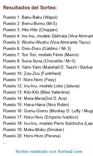 Lista de participantes: Awa-Awa (Califa), Baku-Baku (Wapol), Bane-Bane(Bellamy), Bara-Bara (Buggy), Beri-Beri (Capitán Very Good), Bomu-Bomu (Mr.5), Choki-Choki (Inazuma), Doa-Doa (Blueno), Doku-Doku (Magellan), Doru-Doru (Galdino / Mr.3), Fuwa-Fuwa (Kinjishi no Shiki), Gomu-Gomu (Monkey D. Luffy / Mugiwara), Gura-Gura (Edwar Newgate / Barbablanca), Hana-Hana (Nico Robin), Horo-Horo (Perona), Horu-Horu (Emporio Ivankov), Kage-Kage (Gekko Moriah), Kilo-Kilo (Miss Valentine), Mane-Mane (Bon Clay / Mr.2), Mato-Mato (Vander Decken), Mero-Mero (Boa Hancock), Nikyu-Nikyu(Bartholomew Kuma), Noro-Noro (Foxy), Ori-Ori (Capitana Hina), Ope-Ope (Trafalgar Law), Sabi-Sabi (Capitán Shuu), Shari-Shari (Capitán Sharinguru), Suke-Suke (Absalom), Supa-Supa (Daz Bones / Mr.1), Toge-Toge (Miss Doublefinger), Woshu-Woshu (Vice Almirante Tsuru), Yomi-Yomi (Brook), Hebi-Hebi (Boa Sandersonia), Hebi-Hebi (Boa Marigold), Hito-Hito (Chopper), Hito Hito, modelo Gran Buddha (Sengoku), Inu-Inu, modelo Chacal (Chaka), Inu-Inu, modelo Lobo (Jabura), Inu-Inu, modelo Perro Salchicha (Lasso), Inu-Inu, modelo Dálmata (Vice Almirante Dalmátian), Mogu-Mogu (Miss Merry Christmas), Neko-Neko, modelo Leopardo (Lucci), Tori Tori, modelo Fénix (Marco), Tori-Tori, modelo Halcón (Pell), Uma-Uma, modelo Caballo (Pierre), Ushi-Ushi , modelo Bisonte (Dalton), Ushi-Ushi, modelo Jirafa (Kaku), Zou-Zou (Funkfried), Sara-Sara , modelo Axolote (Smiley), Goro-Goro (God Enel), Hie-Hie (Kuzan / Aokiji), Pika-Pika (Borsalino / Kizaru), Magu-Magu (Sakazuki / Akainu), Mera-Mera(Gol D. Ace), Moku-Moku (Smoker), Numa-Numa (Caribou), Suna-Suna (Crocodile / Mr.0), Yami-Yami (Marshall D. Teach / Barbanegra), Gasu-Gasu (Caesar Clown).
