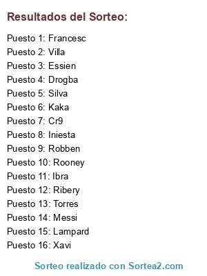 Lista de participantes: Cr9, Messi, Rooney, Ibra, Torres, Kaka, Xavi, Iniesta, Lampard, Essien, Silva, Drogba, Ribery, Robben, Francesc, Villa.