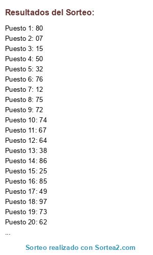 Lista de participantes: 00, 01, 02, 03, 04, 05, 06, 07, 08, 09, 10, 11, 12, 13, 14, 15, 16, 17, 18, 19, 20, 21, 22, 23, 24, 25, 26, 27, 28, 29, 30, 31, 32, 33, 34, 35, 36, 37, 38, 39, 40, 41, 42, 43, 44, 45, 46, 47, 48, 49, 50, 51, 52, 53, 54, 55, 56, 57, 58, 59, 60, 61, 62, 63, 64, 65, 66, 67, 68, 69, 70, 71, 72, 73, 74, 75, 76, 77, 78, 79, 80, 81, 82, 83, 84, 85, 86, 87, 88, 89, 90, 91, 92, 93, 94, 95, 96, 97, 98, 99.